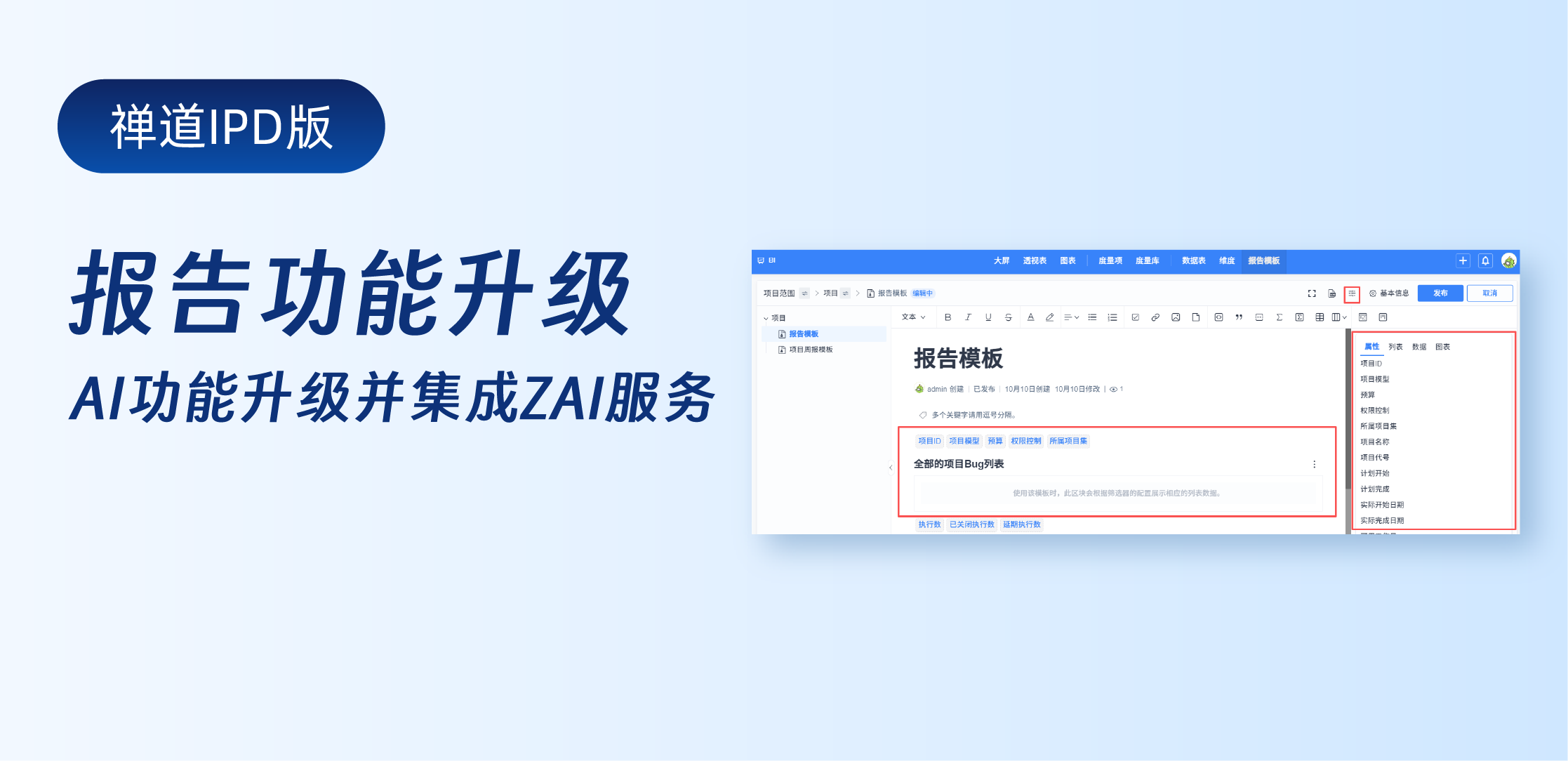 大家好, 禅道IPD版4.5发布啦!本次发布报告和报告模板功能,支持在报告中插入禅道属性、列表、数据、图表内容,系统数据自动填充,快速编写。模板功能帮助您统一格式与内容框架,支持定时生成,让您随时把控项目进展。