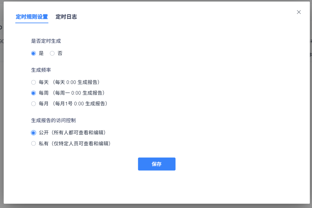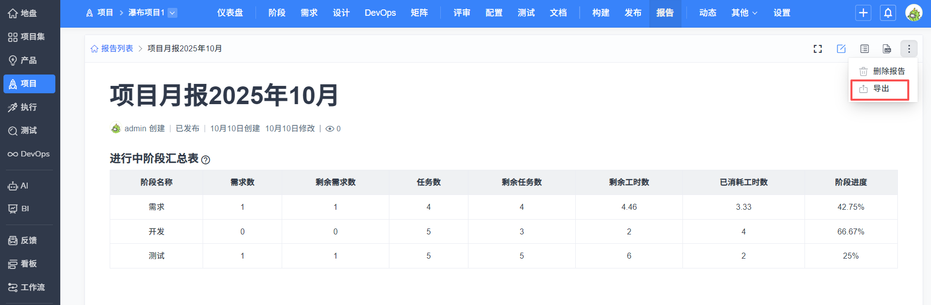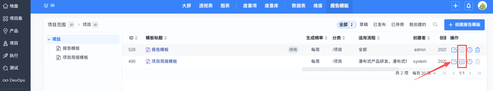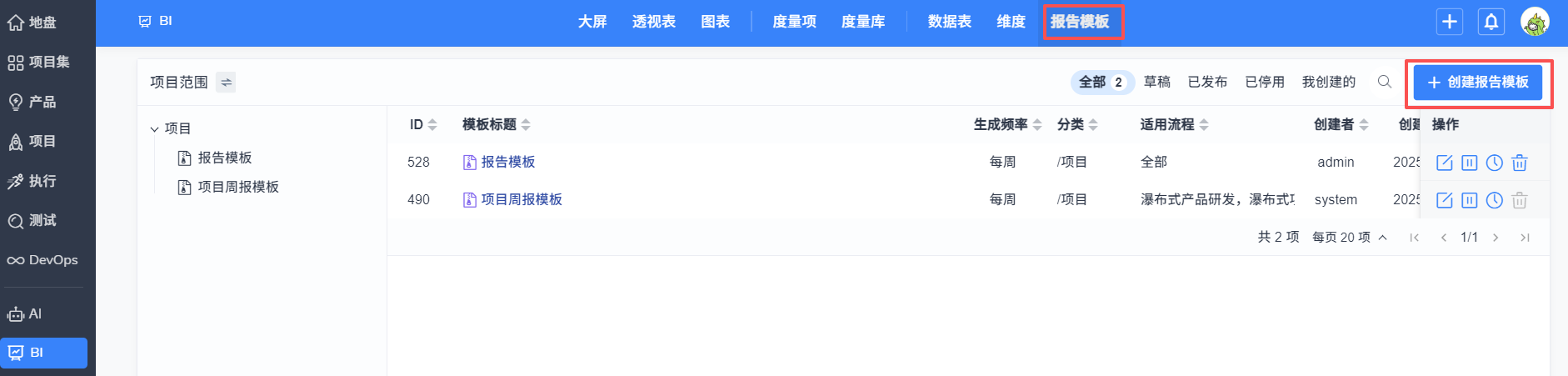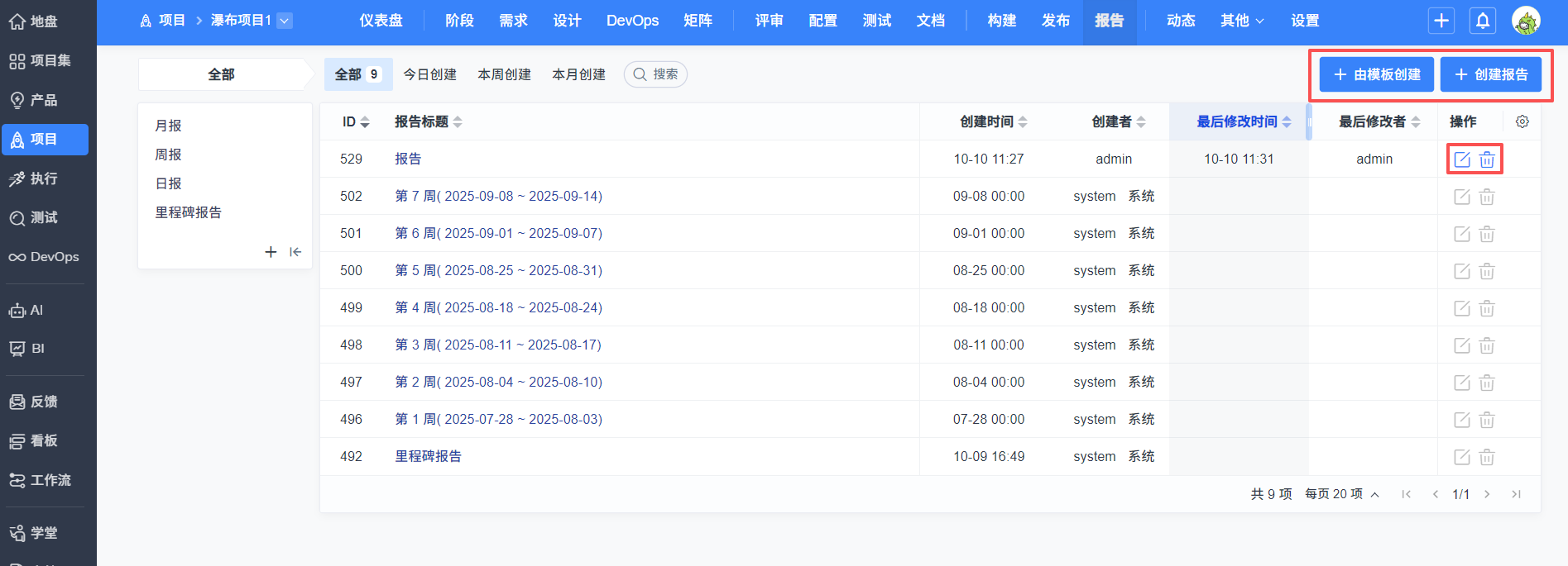 ▼项目下支持创建、编辑、删除报告,也可以选择由模板创建。