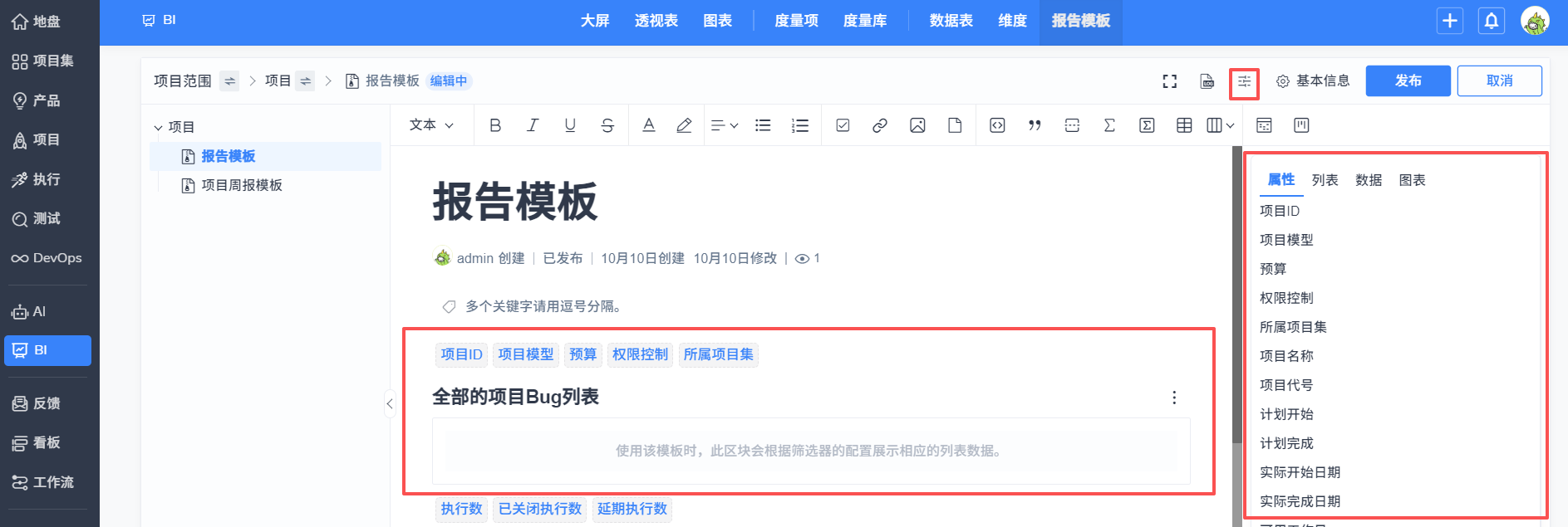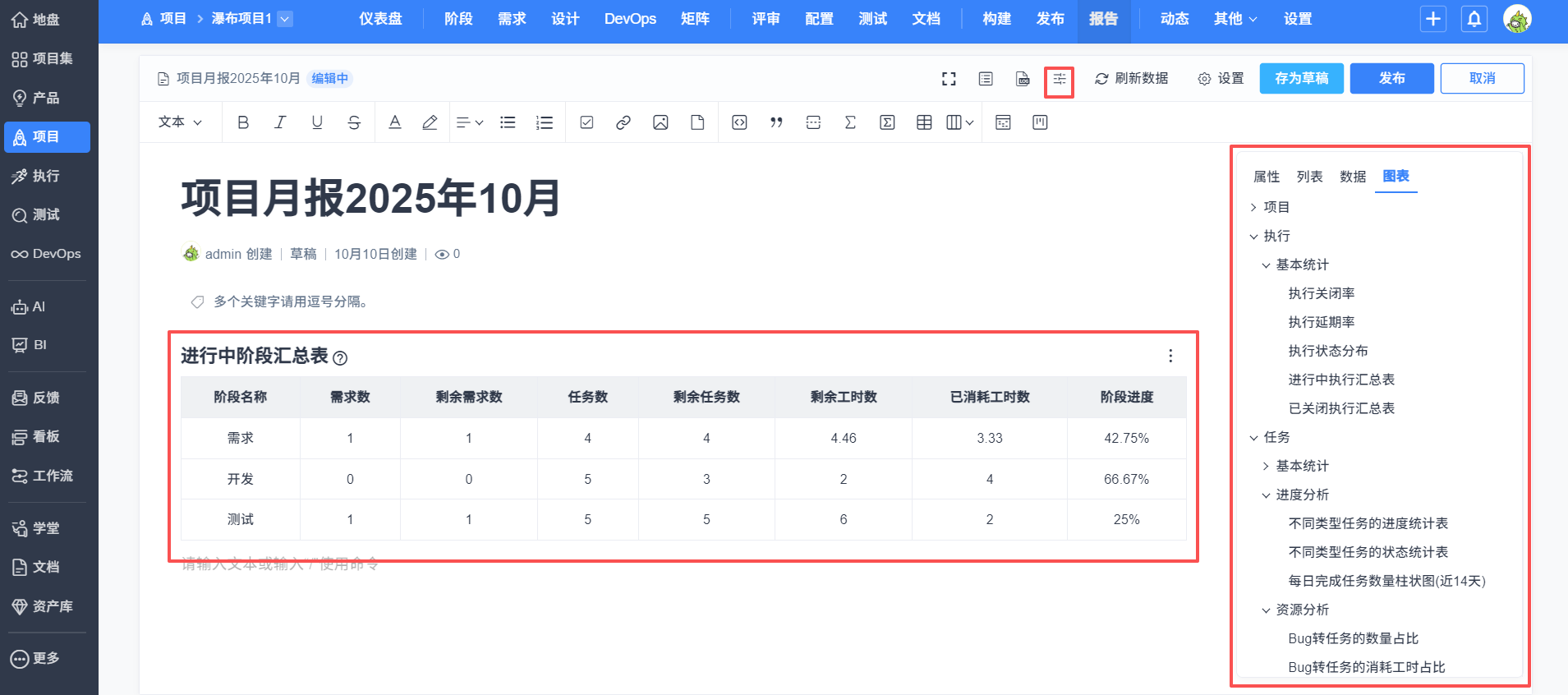 - 报告模板中支持插入禅道系统数据:属性、列表、数据、图表