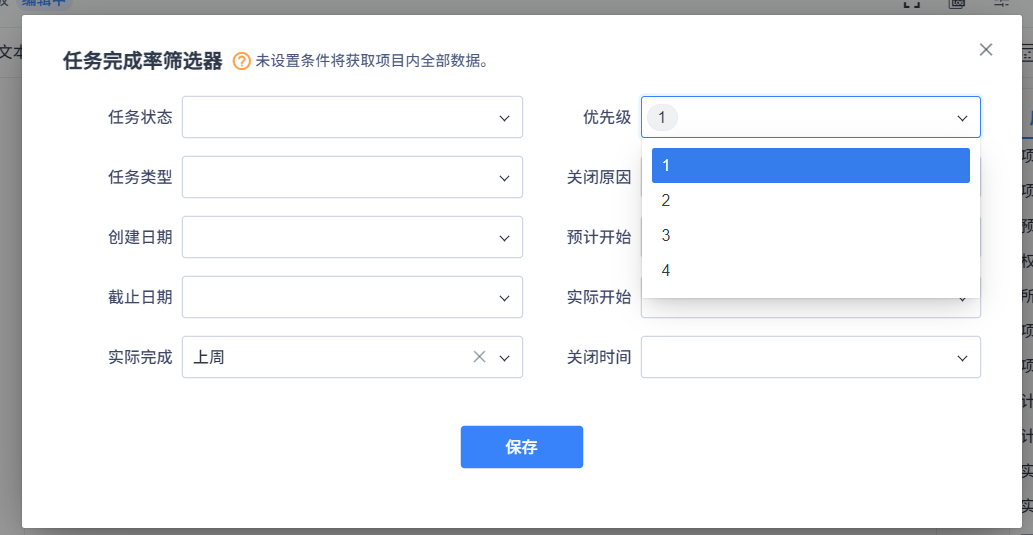 ▼报告中可以插入禅道的属性、列表、数据、图表。您可以在插入时设置筛选条件,获取您需要的数据。