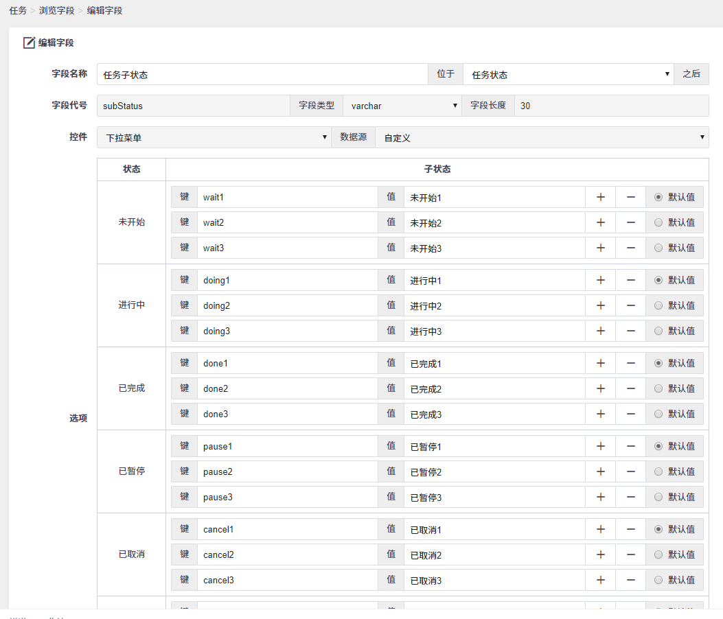 新增的子状态功能是为了满足用户在工作流中对状态做进一步细分,用户可以自定义添加设置子状态,使得在禅道中对产品、发布、需求、项目、任务、Bug、用例、测试单、反馈的状态划分更加灵活。